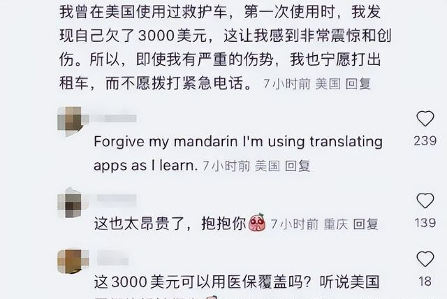 美国网友表示自己生重病宁愿打车都不愿意叫救护车,因为一趟救护车的费用就可能高达3000美元。